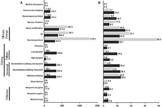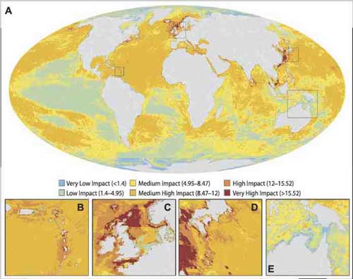 Kebanyakan dampak yang muncul (Gb.2) merupakan akibat dari kegiatan manusia, baik darat maupun laut. Daerah yang mengalaminya adalah bagian utara dekat lautan Norwegia, sekitar laut Cina daerah tenggara, Karibia timur, tepi timur Amerika Utara, Laut Tengah, Teluk Persia, Laut Bering, dan perairan sekitar Srilangka. Daerah-daerah tersebut merupakan daerah patahan dan pertemuan benua (continental shelf and slope). Gambar 2 menunjukkan bahwa dampak akibat perbuatan manusia berkaitan dengan perubahan iklim global yang distribusi secara luas, terutama pada ekosistem tepi laut. Yang pasti, terlihat bahwa dampak terbesar adalah meningkatnya temperatur air laut.Jika kemudian ekosistem laut menjadi berubah, dan tidak lagi memberikan manfaat bagi manusia, maka yang terjadi adalah bencana dari laut. Masih banyak studi yang harus dilakukan, untuk melihat setiap detail dari hubungan manusia dengan ekosistem laut. Tetapi ,sudah waktunya untuk memikirkan perlindungan pada alam lingkungan kita, dan melakukan pemberdayaan secara tepat sehingga bisa mengurangi dampak ekologi sekaligus mempertahankan kemanfaatan laut bagi manusia. Apalagi, Indonesia merupakan negara maritim.