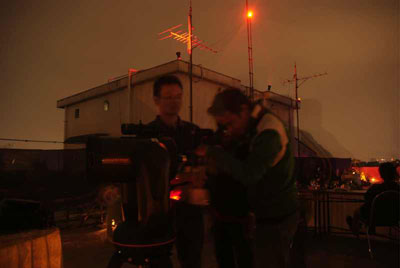 , padahal kan yang namanya pesta langit itu enaknya kalau gelap2an, jadi maklum ya kalau foto-foto-nya pada ajaib, karena memang mengambil gambar dalam (hitam) gelap (malam, ku berdiri melawan sepi .. pakai lagu-nya Anggun – Mimpi…) dan seyogya-nya tidak menggunakan lampu blitz. Okey, mungkin pada akhirnya para wartawan itu nyadar, dan suasana kembali redup. Menarik juga melihat wartawan itu sebegitu penasarannya dengan kegiatan menggunakan teleskop, sampai-sampai kamera video digunakan untuk merekam langsung dari teleskop.