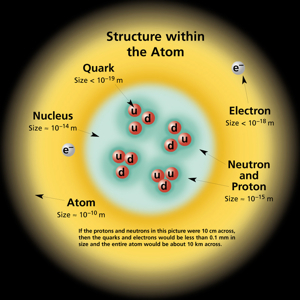 Gambar di samping menggambarkan susunan kasar sebuah atom dan zarah-zarah yang menyusunnya. Seandainya inti atom yang terdiri atas proton dan neutron memiliki garis tengah 10 cm, maka sebuah quark hanya akan memiliki garis tengah 0.1 mm, sementara seluruh atom akan bergaris tengah 10 km(!). Materi, dengan demikian, sebagian besar berisi ruang kosong saja.