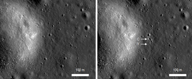 Lokasi Chang’e 3 dan robot Yutu akhirnya dipastikan sepenuhnya setelah satelit LRO melintas di atas lokasi pendaratan pada 25 Desember 2013 pukul 10:53 WIB pada ketinggian 150 km dari permukaan Bulan, yang memungkinkan kamera LRO memotret koordinat Chang’e 3 dengan resolusi hingga 150 meter/pixel 150 cm/pixel. Perbandingan dengan citra lokasi yang sama yang diambil satelit LRO pada 30 Juni 2013 menunjukkan kehadiran dua tonjolan baru, yang tak ada pada citra 30 Juni 2013. Tonjolan itu jelas bukan benda alamiah layaknya bongkahan batu Bulan, karena topografi lokasi tersebut nyaris datar (sehingga tak memungkinkan ada longsoran yang menggerakkan batu Bulan) dan tiada gunung berapi di Bulan pada masa kini (sehingga tak mungkin ada letusan yang mampu melontarkan bongkahan batu). Dua tonjolan itu juga bukanlah batu yang hadir dari luar Bulan sebagai meteorit, karena jatuhnya meteorit ke Bulan selalu diiringi dengan pembentukan kawah dan cipratan material produk hantaman ke sekeliling kawah. Hanya ada satu alasan terkait kehadiran dua tonjolan baru itu. Itulah Chang’e 3 dan Yutu.