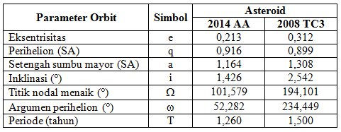 Baik asteroid 2008 TC3 maupun 2014 AA merupakan bagian keluarga asteroid dekat Bumi (near earth asteroid) kelas Apollo sehingga orbitnya, sebelum jatuh ke Bumi, merentang di antara orbit Venus hingga Mars. Tetapi perbandingan parameter orbit kedua asteroid menunjukkan meskipun keduanya sekeluarga, namun mereka adalah asteroid yang sama sekali berbeda sehingga tidak berasal dari satu induk yang sama.