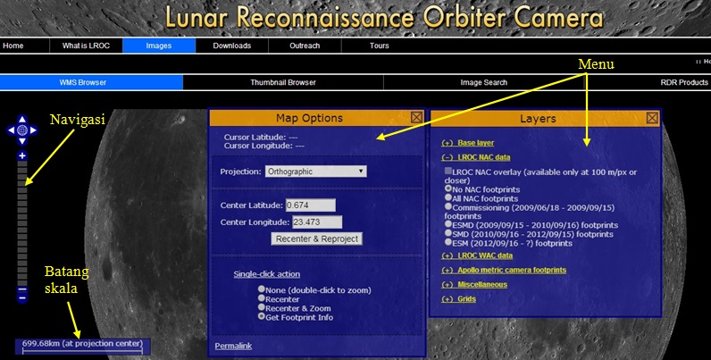 Di sini penulis menggunakan peta WMS Image yang disajikan School of Earth & Planetary Exploration di Arizona State University, Arizona (AS). Peta ini menyediakan opsi menjejak permukaan Bulan pada koordinat yang dikehendaki dan pada resolusi yang lebih tinggi dibanding 100 meter per piksel dengan memanfaatkan menu-menunya seperti “Map Options” dan “Layers“. Saat laman peta WMS Image dibuka, maka akan muncul menu “Map Options“. Dalam menu ini terdapat sub-menu “Projection“, yang perlu dipilih sebagai “Ortographic“, sementara sub-menu “Latitude” (lintang) dan “Longitude” (bujur) masing-masing dituliskan angka +0,674 dan +23,473. Selanjutnya sub-menu “Single-click action” kita pilih “Get footprint info.”
