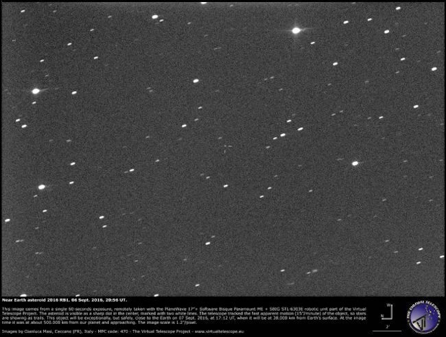 Nah, asteroid yang akan melintas malam ini (8 September 2016) merupakan asteroid yang baru ditemukan pada tanggal 5 September 2016 dalam survei langit Mt.Lemmon yang merupakan bagian dari survei langit Catalina. Namanya, asteroid 2016 RB1. Dari jarak dan kecerlangan, asteroid 2016 RB1 diperkirakan berukuran 7,3 – 16 meter atau setengah dari ukuran meteor yang meledak di Chelyabinsk, Russia bulan Februari 2013.