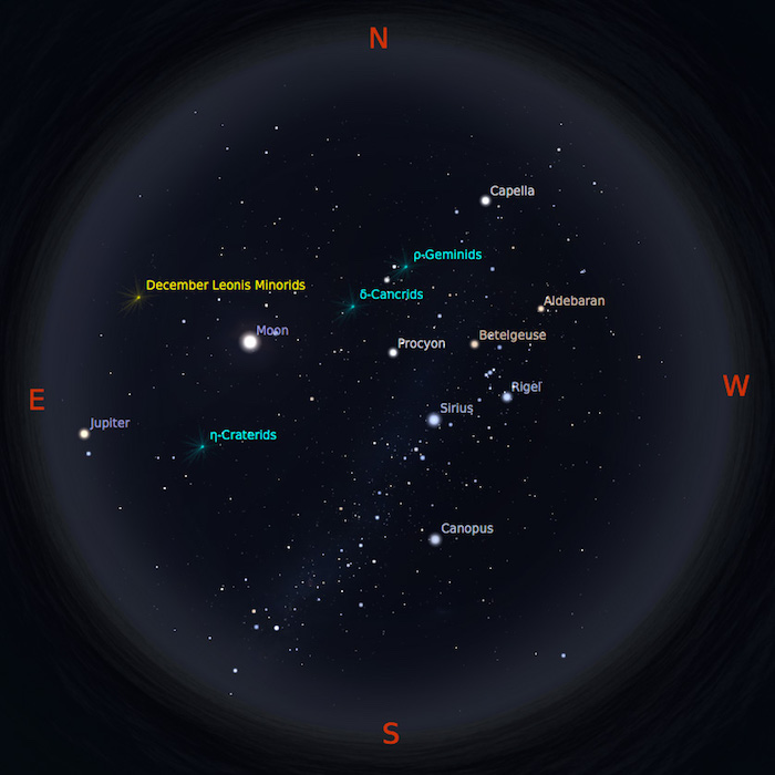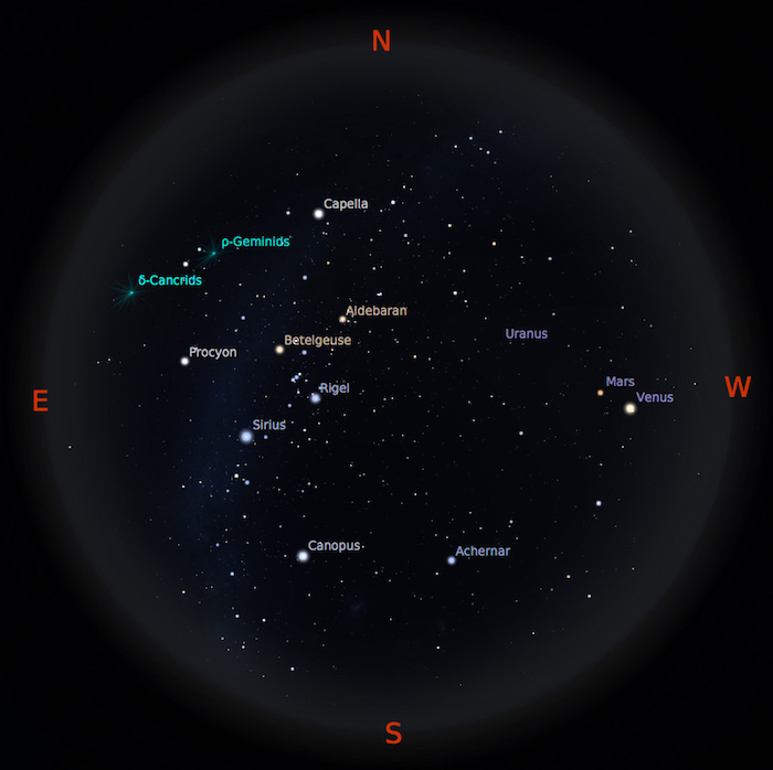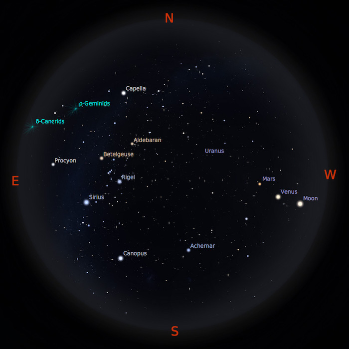 Venus & Mars. Si bintang kejora dan planet merah akan setia menemani setelah Matahari terbenam. Keduanya akan tampak selama beberapa jam sampai kedua planet ini terbenam di ufuk barat. Venus yang cemerlang di langit barat akan bertemu bulan sabit setelah Matahari terbenam pada tanggal 2 Januari dan 31 Januari. Tanggal 3 Januari, giliran Mars yang berpapasan dengan Bulan.