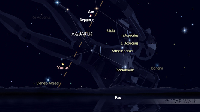 Mars dan Neptunus akan tampak berpasangan di langit senja sejak Matahari terbenam sampai kedua obyek ini terbenam pada pukul 21:55 WIB dan 21:54 WIB. Kedua planet ini hanya terpisah 0,02º. Tapi untuk bisa melihat Neptunus, pengamat membutuhkan teleskop. Mars bisa dilihat dengan mata tanpa alat.