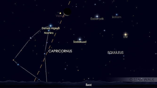 Bulan sabit tipis dan bintang kejora akan jadi pasangan di langit setelah Matahari terbenam dengan jarak 2º. Keduanya bisa dilihat dengan mata tanpa alat di ufuk barat sampai Bulan dan Venus terbenam pada pukul 21:13 WIB dan 21:22 WIB.