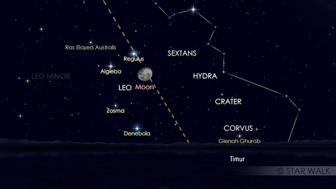 Bulan dan Regulus bintang paling terang di rasi Leo ini akan tampak berpasangan dan terpisah 0,9º pukul 11:07 WIB. Keduanya tampak berpasangan di langit pada tanggal 14-15 Januari setelah Bulan dan rasi Leo terbit. Bulan terbit pukul 19:54 WIB pada tanggal 14 Januari dan pukul 20:43 WIB pada tanggal 15 Januari. Bulan sedang dalam fase cembung besar dan pasangan ini bisa diamati sampai Matahari terbit.