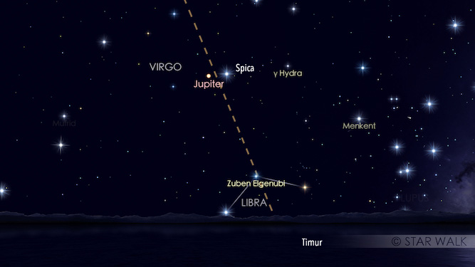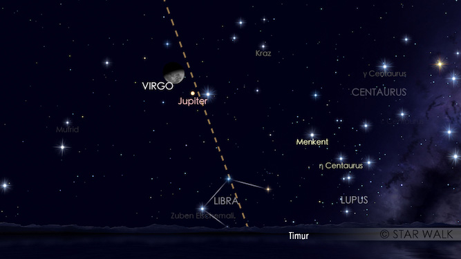 Planet terbesar di Tata Surya ini akan tampak berpasangan dengan Spica atau alpha Virgo di rasi Virgo. Keduanya hanya terpisah 3,5º dan dapat diamati sejak Jupiter terbit pada pukul 22:28 WIB sampai fajar. Bulan yang baru melewati fase Bulan Baru sangat membantu pengamat untuk bisa menikmati obyek lainnya di langit malam, baik planet seperti Merkurius dan Saturnus yang akan terbit sebelum fajar maupun bintang-bintang. Bulan terbit setelah fajar.