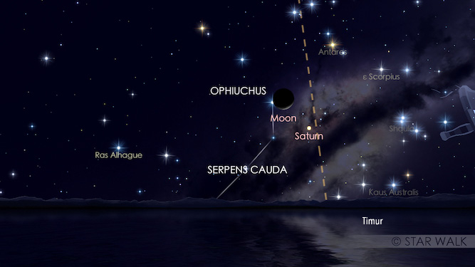 Bulan sabit tipis akan tampak berpasangan dengan Saturnus di rasi Ophiuchus. Keduanya hanya terpisah 4º dan tampak terbit beriringan di ufuk timur dimulai dari Bulan yang terbit pukul 02:30 WIB disusul Saturnus 27 menit kemudian pada pukul 02:57 WIB. Keduanya bisa diamati sampai Matahari terbit pukul 05:48 WIB.