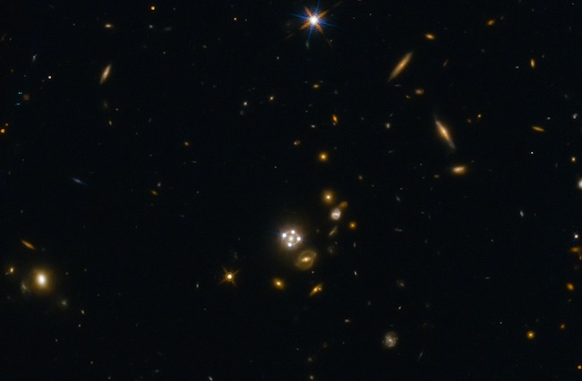Akibatnya, galaksi jauh yang seharusnya tersembunyi di balik galaksi masif yang dekat, justru bisa tampak. Untuk pengamatan ini, galaksi jauh itu tampak di foto yang diambil. Menariknya, kita seperti melihat hantu dari galaksi-galaksi jauh dalam foto seperti penampakkan berulang-ulang. Kamu bisa melihat efek ini di tengah foto yang ada di bawah ini.
