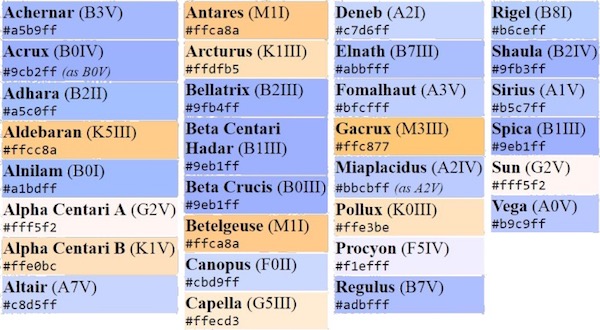 Berikut ini merupakan tabel warna dari berbagai bintang, termasuk Matahari (Sun).