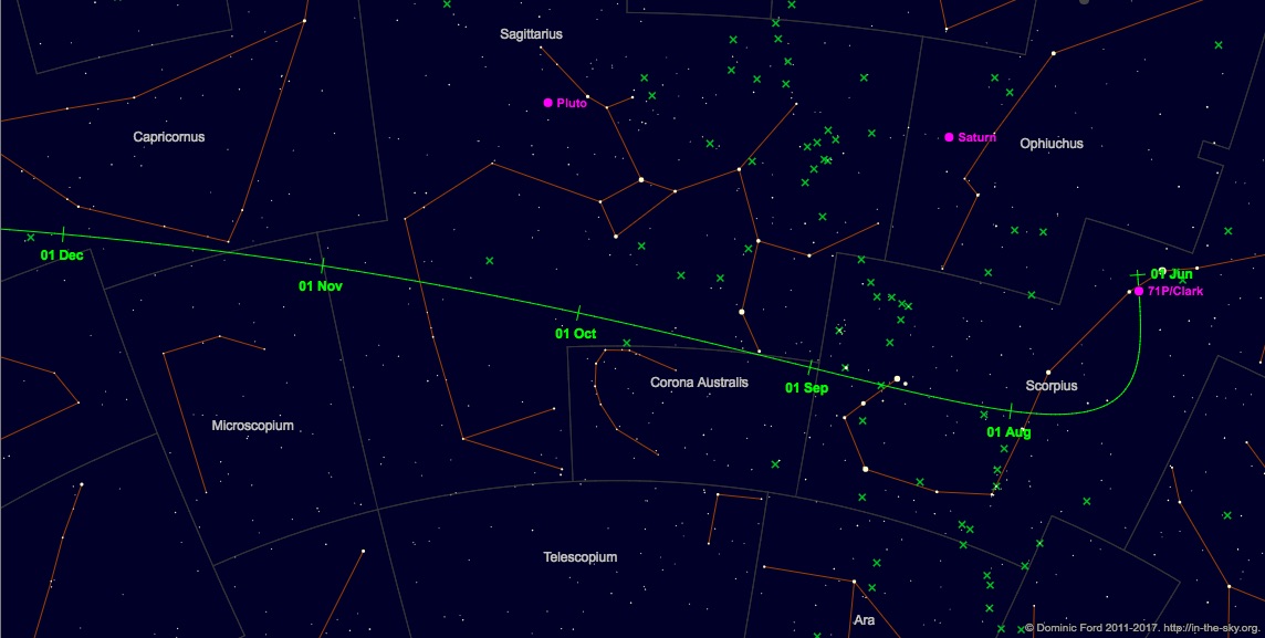 Selama bulan Juni, Komet 71P/Clark akan tampak di rasi Scorpius dengan kecerlangan 11,2 magnitudo dan bisa diamati sejak Matahari terbenam sampai jelang Matahari terbit. Butuh teleskop untuk bisa melihat komet Clark ini.