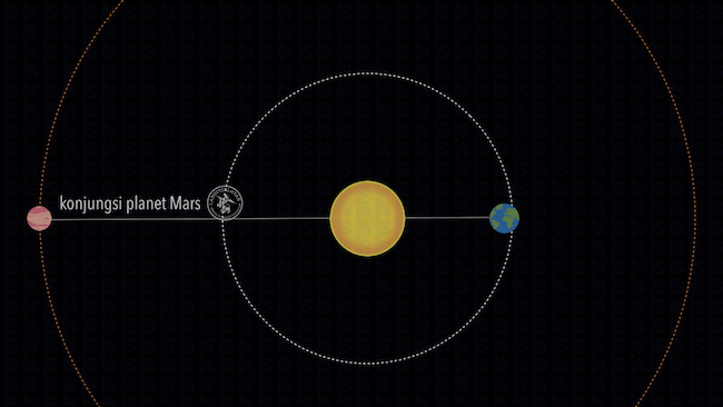 Mars, si planet merah akan berada di posisi terjauhnya dari Bumi dan berada di balik Matahari jika dilihat dari Bumi. Artinya, pengamat di Bumi tidak akan bisa melihat kehadiran planet merah ini di langit malam. Mars akan terbit dan terbenam hampir bersamaan dengan Matahari.