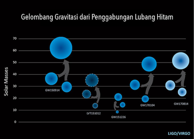 Tercatat sampai saat ini ada 5 gelombang gravitasi yang dideteksi dari penggabungan dua lubang hitam. Empat diantaranya sudah berhasil dikonfirmasi sebagai gelombang gravitasi sementara ada satu sinyal gelombang gravitasi yang masih berupa kandidat yakni LVT151012. Ketiga gelombang gravitasi lainnya yang berhasil dideteksi detektor Advanced Laser Interferometer Gravitational Wave Observatory (LIGO) adalah GW150914, GW151226, dan GW170104. Ketiganya merupakan hasil tabrakan dan penggabungan dua lubang hitam dengan massa yang cukup besar.