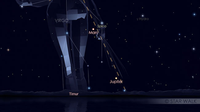 Mars dan Spica bisa diamati sejak keduanya terbit beriringan di ufuk timur sebelum fajar menyingsing. Keduanya hanya terpisah ~3º. Mars terbit pukul 02:38 WIB dan keduanya akan tampak sampai Matahari terbit.