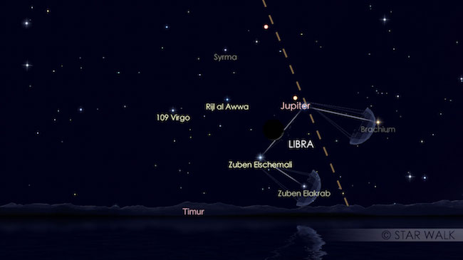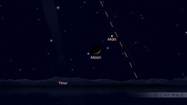 Bulan dan Jupiter tampak berpasangan di ufuk timur sebelum fajar menyingsing, dan bisa diamati sejak keduanya terbit. Jupiter akan terbit terlebih dahulu pada pukul 02:53 WIB disusul Bulan sabit pada pukul 03:07 WIB dan hanya terpisah 4,7º.