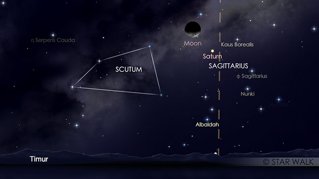 Sehari setelah Mars, Saturnus memperoleh kesempatan bertemu Bulan dan berpasangan sejak terbit beriringan. Bulan akan terbit lebih dahulu pada pukul 00:43 WIB dan disusul Saturnus pukul 00:58 WIB dan hanya terpisah 3º di langit.
