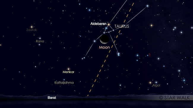 Bulan Sabit dan bintang Aldebaran di rasi Taurus akan tampak berpasangan sangat dekat, hanya terpisah 6,2º di langit pada tanggal 23 Maret setelah Matahari terbenam sampai keduanya terbenam di ufuk barat. Bulan terbenam lebih dahulu pukul 21:58 WIB disusul Aldebaran pukul 22:20 WIB.