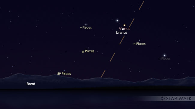 Siapkan teleskopmu dan saksikan pasangan Venus dan Uranus di ufuk barat setelah Matahari terbenam. Keduanya hanya terpisah 0,5º di langit senja dan dapat diamati sampai kedua planet ini terbenam pukul 19:00 WIB.