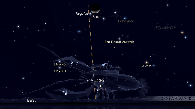Pengamat bisa menikmati Bintang Kejora dan Bulan Sabit yang berpasangan di langit senja setelah Matahari terbenam. Keduanya hanya terpisah 2,3º di rasi Cancer dan tampak beriringan menuju ufuk barat. Venus terbenam lebih dahulu pada pukul 20:22 WIB disusul Bulan dua menit kemudian pada pukul 20:24 WIB. Bulan sabit yang baru berusia 3 hari itu akan tampak dengan kecerlangan -10,3 magnitudo sedangkan Venus dengan kecerlngan -4 magnitudo.