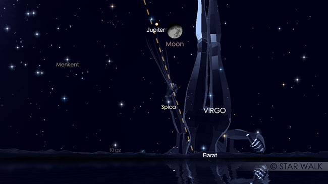 Bulan Cembung dan Jupiter berkonjungsi di rasi Libra dan bisa diamati ssetelah Matahari terbenam pada ketinggian 52° di atas horison pada arah timur. Pasangan Bulan dan Jupiter akan mencapai titik tertinggi yakni 82º pada pukul 20:24 WIB di arah selatan. Keduanya terpisah 4,2º dan bisa diamati sampai lewat tengah malam saat keduanya terbenam bersama-sama pada pukul 02:35 WIB.