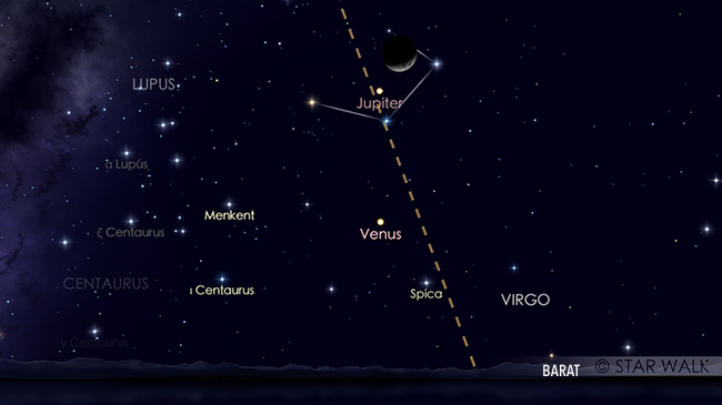 Bulan Sabit dan Jupiter berkonjungsi di rasi Libra dan sudah melewati meridian langit saat Matahari terbenam. Keduanya bisa diamati sampai pukul 21:00 WIB saat Jupiter terbenam pukul 21:31 WIB disusul Bulan pada pukul 21:56 WIB. Keduanya tampak terpisah 4,8º.